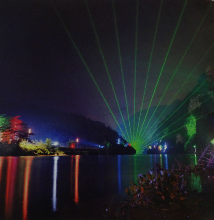 廣東省清遠(yuǎn)市連州龍?zhí)抖葏^(qū),本項(xiàng)目采用鐳博激光(www.lb-laser.com)4臺(tái)戶外綠色景區(qū)激光燈。用激光把湟川三峽文化背景表現(xiàn)的淋漓盡致。游船在湟川三峽前行,進(jìn)入龍?zhí)�,第一臺(tái)激光在雷電聲,用激光演藝出一條龍從龍?zhí)吨幸卉S而出,時(shí)而飛躍,時(shí)而戲水;游船緩緩前行,第二臺(tái)激光演藝出一個(gè)大大的時(shí)空遂道,把整個(gè)江面給包圍,游船在時(shí)空遂道穿行,仿佛在夢幻中進(jìn)入仙境;突然一只羊的咩咩叫聲把游客代回人間,第三臺(tái)激光演藝,一只羊緩緩從山腳下一邊玩耍,一邊吃草,到了懸崖邊上,后退幾步飛躍跳過懸崖,從而得名羊跳峽;游船繼續(xù)前行,進(jìn)行龍?zhí)渡嫌�,第四臺(tái)激光演藝魚躍龍門,龍?zhí)抖妹�。龍�(zhí)稓v史被激光效果表現(xiàn)的淋漓盡致,呈現(xiàn)在游客眼前。